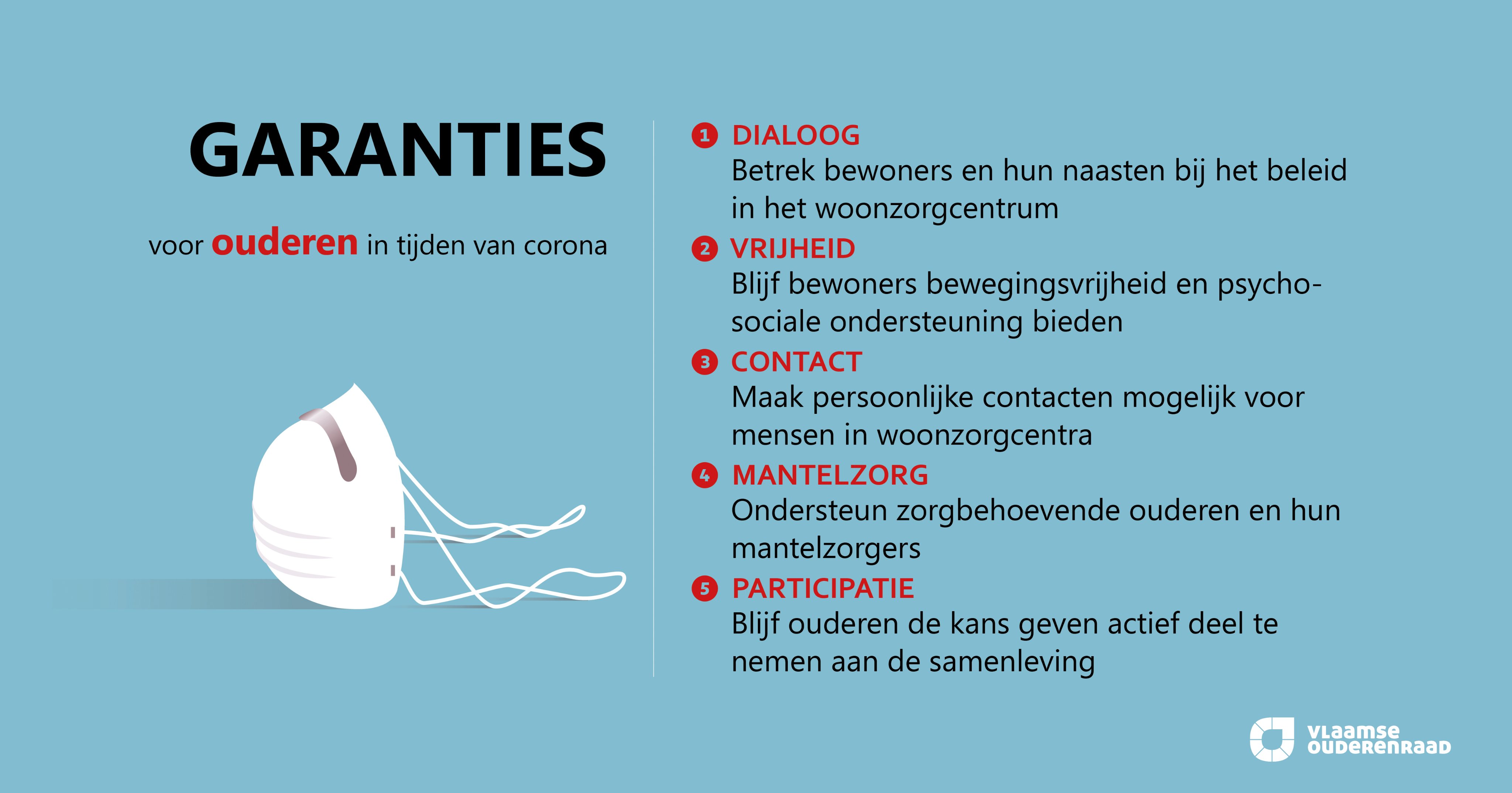 De Vlaamse Ouderenraad maakte ook een bondige visual van de 5 garanties. Je vind 'm hier.